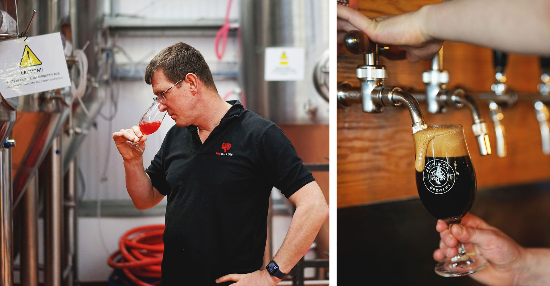 Left:Toby McKenzie of RedWillow samples a beer in the cellar.Right: Double Heritage Porter poured from the side-pull faucet.