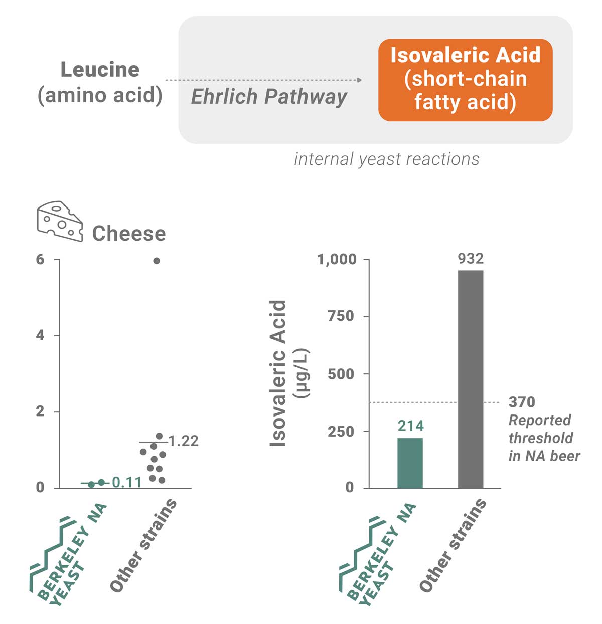 You may be familiar with isovaleric acid from Brettanomyces-infected beer, from aged hops, or from sweaty gym socks. (Fun fact: socks get cheesy because the skin microbiome is doing the same chemistry as in wild-fermented beer—it's converting the amino acid leucine, from body sweat, into isovaleric acid.) To firm up our suspicion, we measured isovaleric acid in NA beer made with a Berkeley NA strain and in another commercial NA strain that ranked higher for the cheese descriptor. Sure enough, the levels of isovaleric produced by our strain were well-below the reported flavor threshold, and the other strain produced levels well-above it (Figure 5, bottom right).