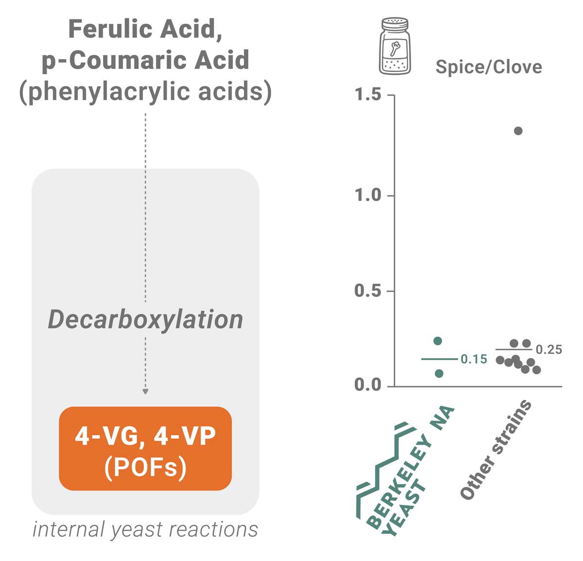 Second, let’s look at the “spice/clove” descriptor, which is commonly associated with the chemical compound 4-vinyl guaiacol (4-VG). 4-VG production is common for wild yeast, and the strains that make it are referred to as “POF-positive” because of the phenolic off-flavors” they produce. Why do wild strains make this compound? In the left panel, Figure 6 shows the metabolic pathway illustrating how wild yeast produce the phenol 4-VG from phenylacrylic-acid precursors found in plant-cell walls, including barley. The chemistry is directly related to yeast’s ability to detoxify phenylacrylic acids. 4-VG is a by-product of the detoxification process. This trait is useful in the wild world outside the fermentor because undomesticated yeast primarily live on plants.