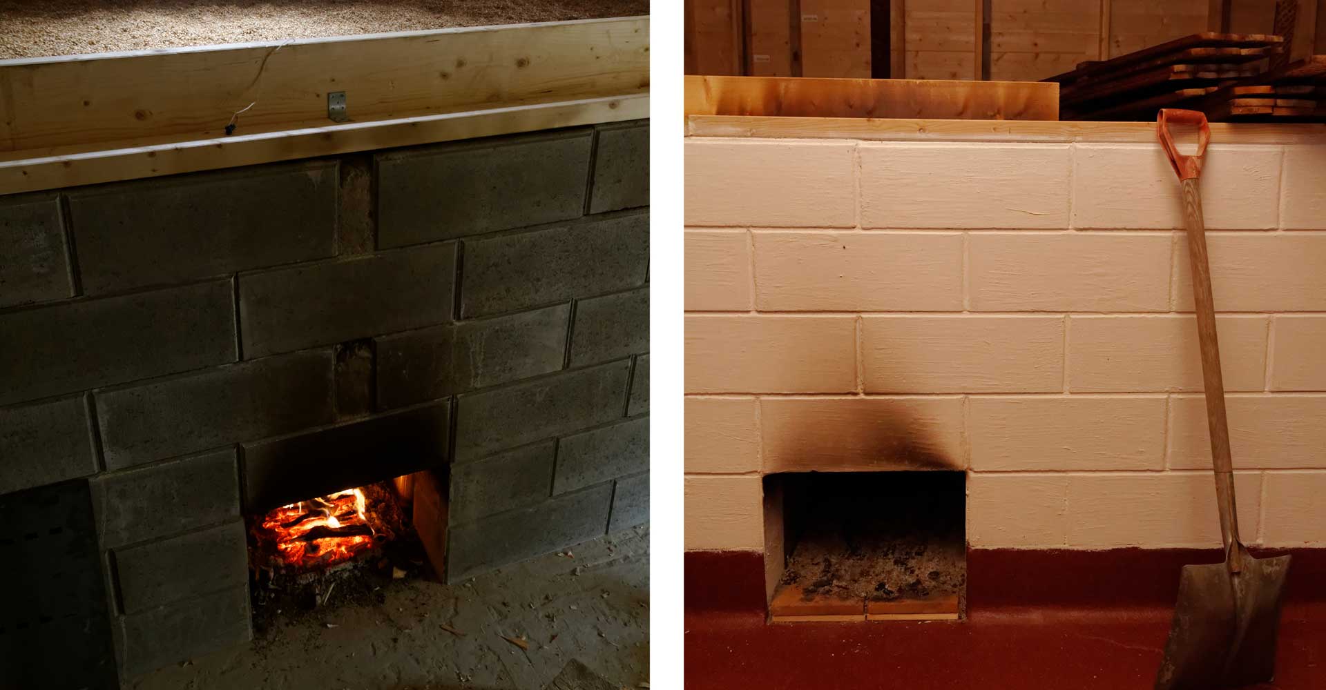 To dry the malt, the brewers spread it out fairly thinly on the planks, then they burn alderwood in the fireplace. The heat and smoke fill the box, then they rise through the holes in the planks, heating the green malt and suffusing it with smoke. It usually takes about two days for the malt to dry.