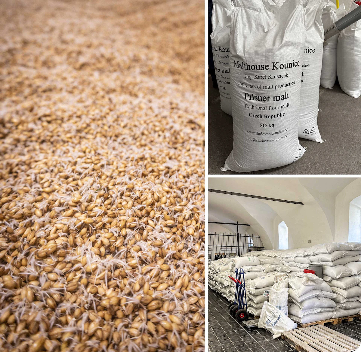 Clockwise from far left: Germinating malt in the Pilsner Urquell malthouse; Únětický Pivovar malt from Malthouse Kounice; pallets of Sladovny Soufflet malt at the Břevnov Monastery Brewery.