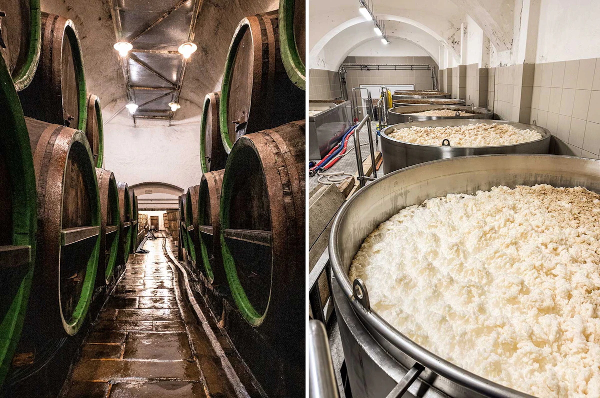 From left: Wooden aging tanks in the Pilsner Urquell cellar still ferment beer served on the brewery tour; open fermentors at Únětický Pivovar.