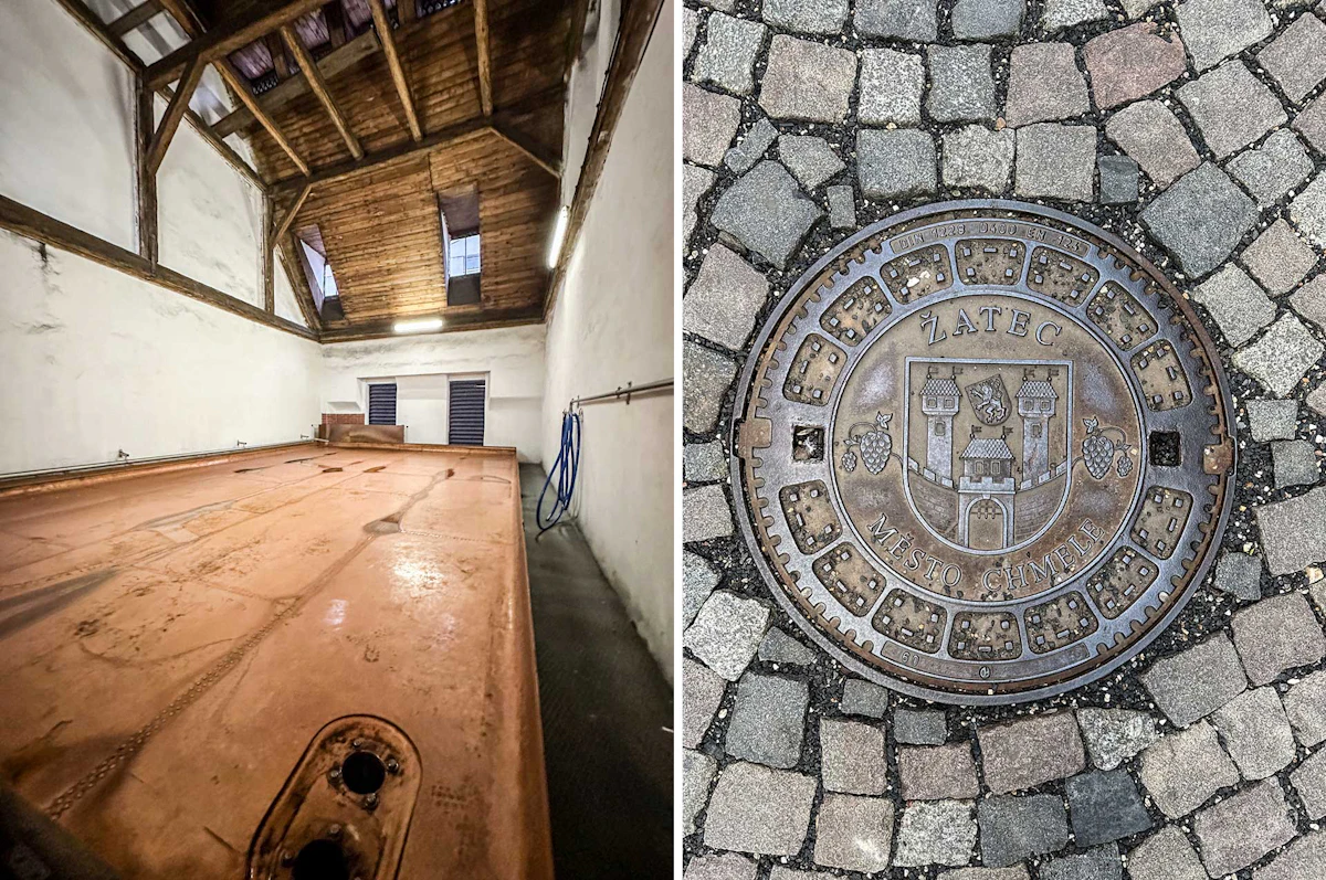 From left: The coolship at U Fleků is just for cooling, not spontaneous innoculation; the manhole covers in Žatec proclaim it “city of hops”