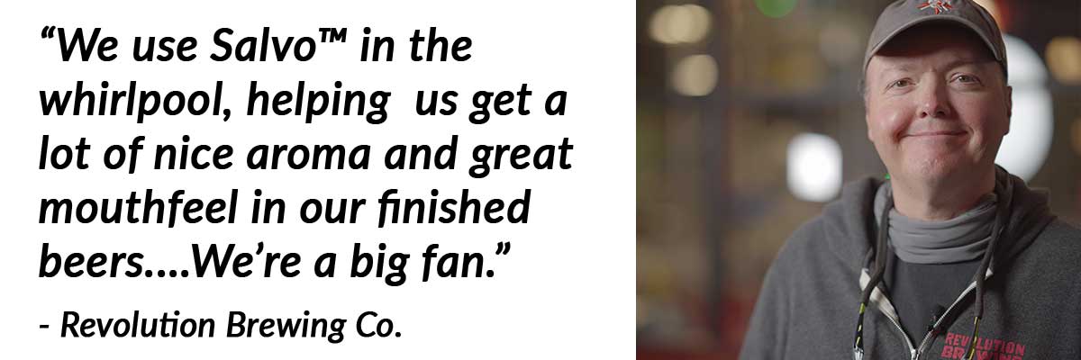 Brewmaster Jim Cibak has been with Revolution Brewing from Day One. “We are focused on brewing IPAs, and we like to extract as much clean, beautiful, fragrant aroma from our hops as we can,” says Cibak. “You want as much impact as possible, but you want to keep that trub pile small because in the end, more wort going to the fermentor means more finished beer. We use Salvo™ in the whirlpool, and that really helps us get a lot of nice aroma and great mouthfeel in our finished beers without having to send a tremendous amount of hop material into the whirlpool. We’re a big fan.”