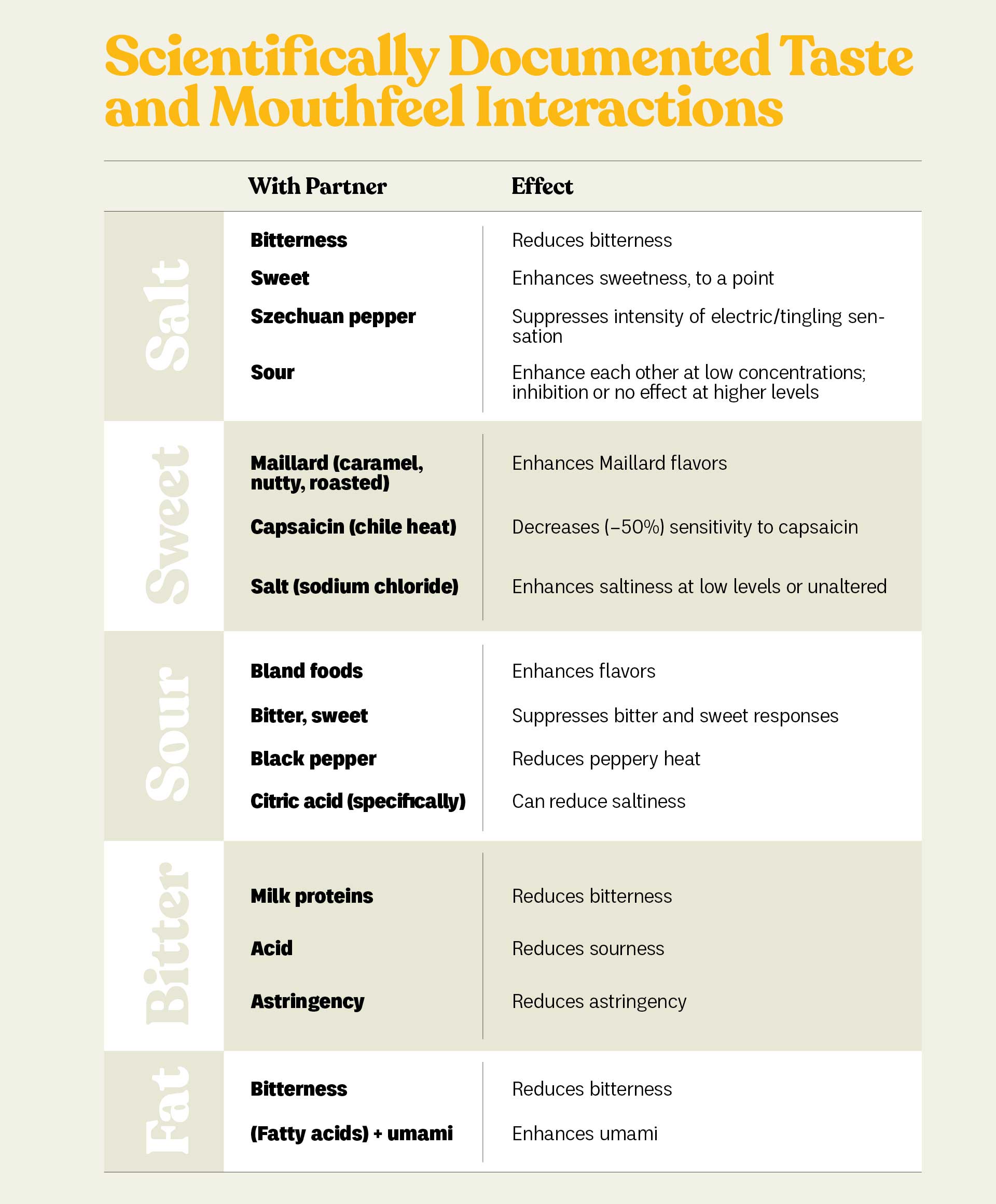 Second, find ways to deal with interacting tastes and mouthfeel sensations. There are multiple well-known interactions, many of which have been verified by the science. The chart at the right lists documented sensory interactions that are useful in food-and-beverage pairing. Bitterness in beer—and I would include roasty/toasty flavors here—is especially useful because it can reduce both sweetness and fattiness. Tannins in wine function similarly, but just for fat—one reason why red wine works with red meat. If you’re working with chefs who are more accustomed to pairing with wine, be sure to explain this—or better yet, demonstrate this—for them.