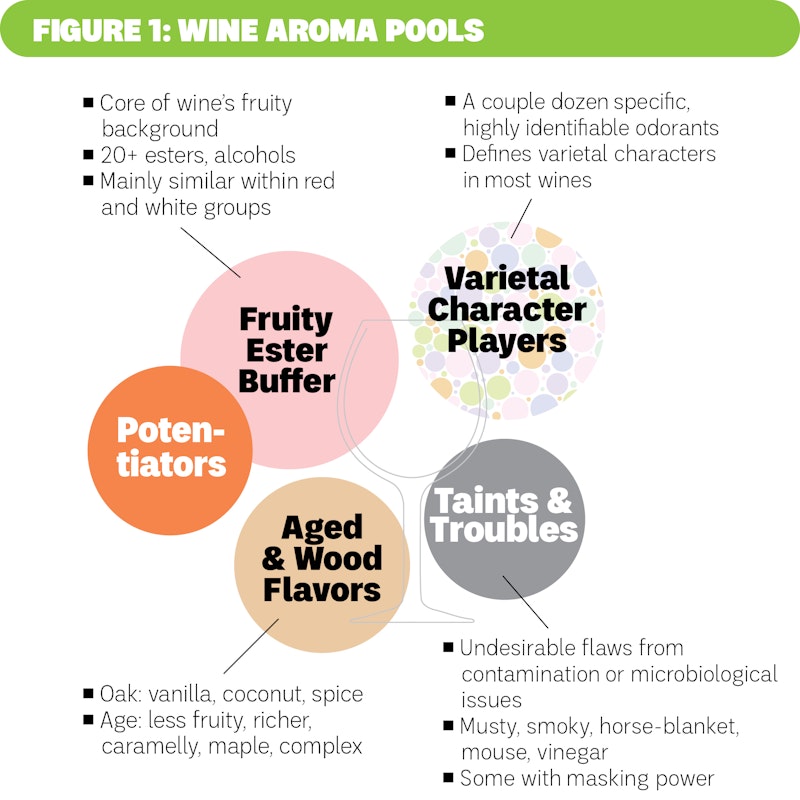 Figure 1 sums this up: Wine has a pool of self-amplifying fruity odors and a second pool of mostly spice and cooked aromas derived from wood, especially in reds. An unruly set of varietal aromas are different enough from fruity esters to stand out from them, although some can simultaneously enhance fruitiness. Finally, there are bad actors sowing destructive mayhem.