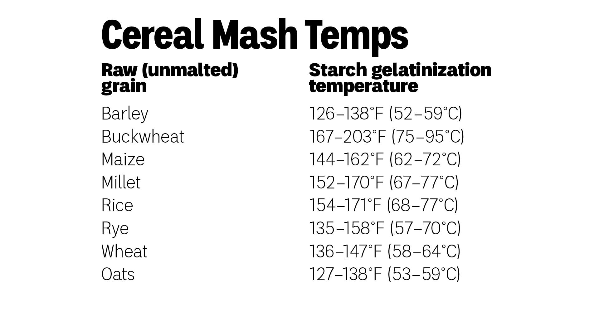 However, for those using corn, rice, or other grains that haven’t been gelatinized, you’re going to need to crack the starch-conversion code—hence, the cereal mash. The exact temperatures depend on what you’re mashing (see chart above), but the process is effectively the same: