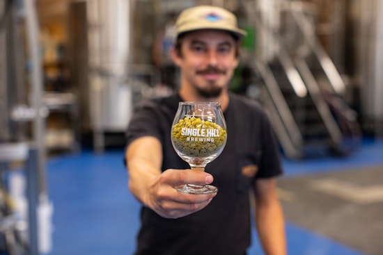 Single Hill Brewing in Yakima, Washington, has made a name for itself as a place where brewers like to drink when they’re in town for hop selection, where local hop growers like to drink year-round, and where you’re guaranteed to find a prolific range of fresh-hopped beers during harvest season and beyond. When it is harvest time, Single Hill cofounder and head brewer Zach Turner and his team hop in the van and drive around the valley, picking up whatever hops they’ve heard are being freshly harvested, so they can get them back to the brewery as quickly as possible and brew with them in a number of ways. That includes throwing in some whole cones as well a using their own small-scale pelletizer, making fresh-hop pellets to use that day or soon afterward.