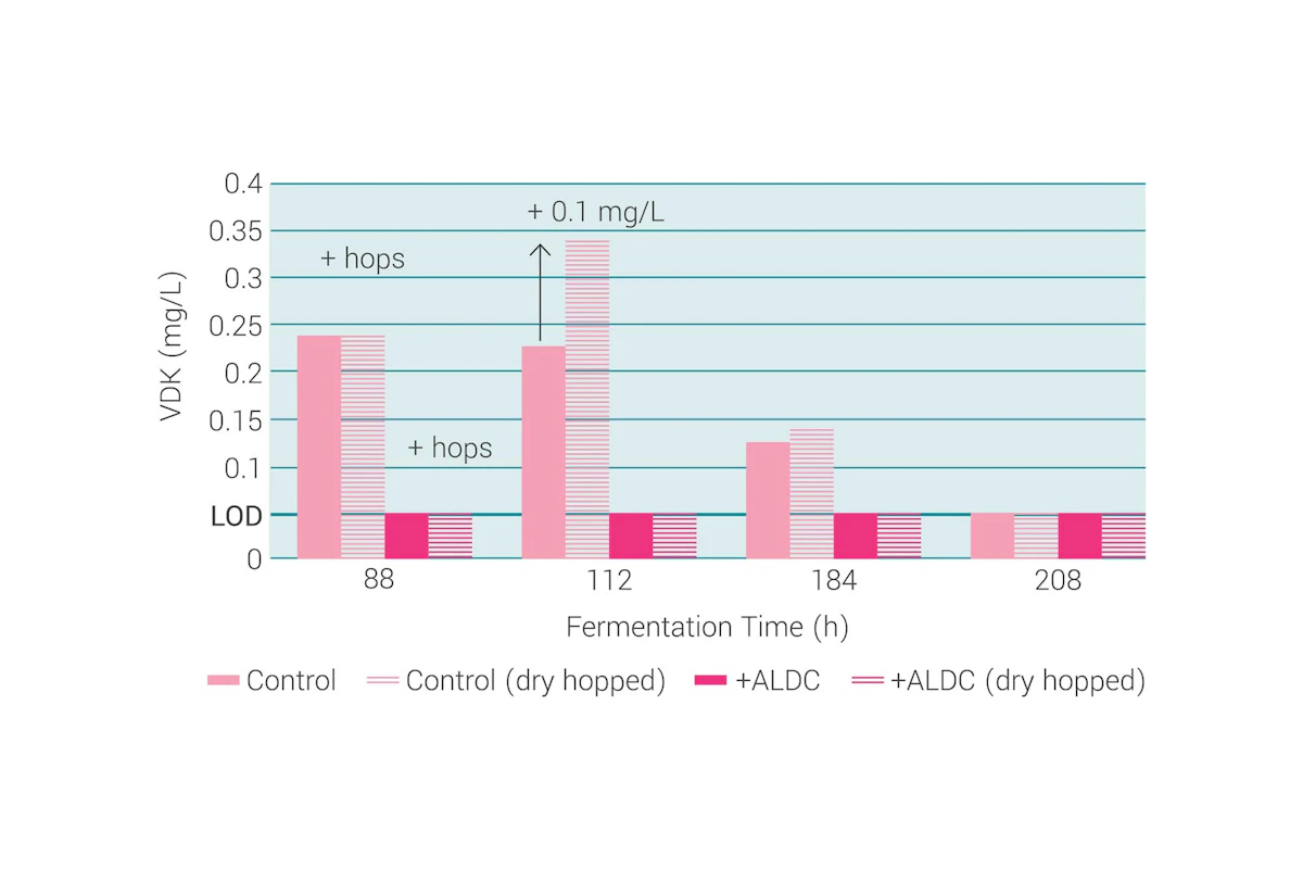 In a study, the renewed availability of fermentable sugars when dry hopping resulted in further yeast activity and VDK production in control samples, but not when ALDC (3 g/hL) was added.