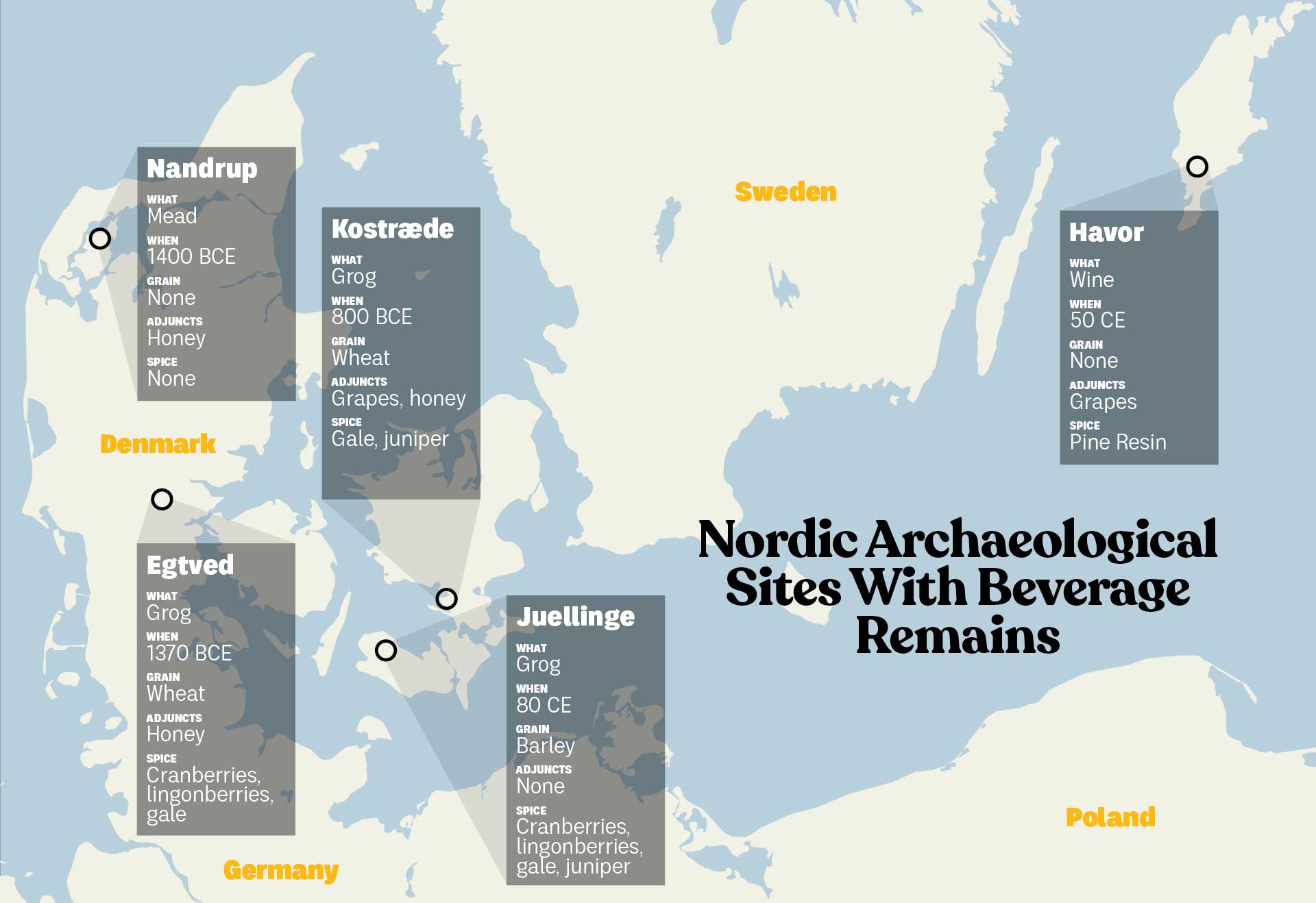 That changed in 2013, when Patrick McGovern and colleagues at the University of Pennsylvania published a new analysis of four archaeological drink finds from Denmark and Sweden. Their finds, and the similarity with the Egtved Girl’s drink, led them to coin the name “Nordic grog” to describe these ancient beverages.