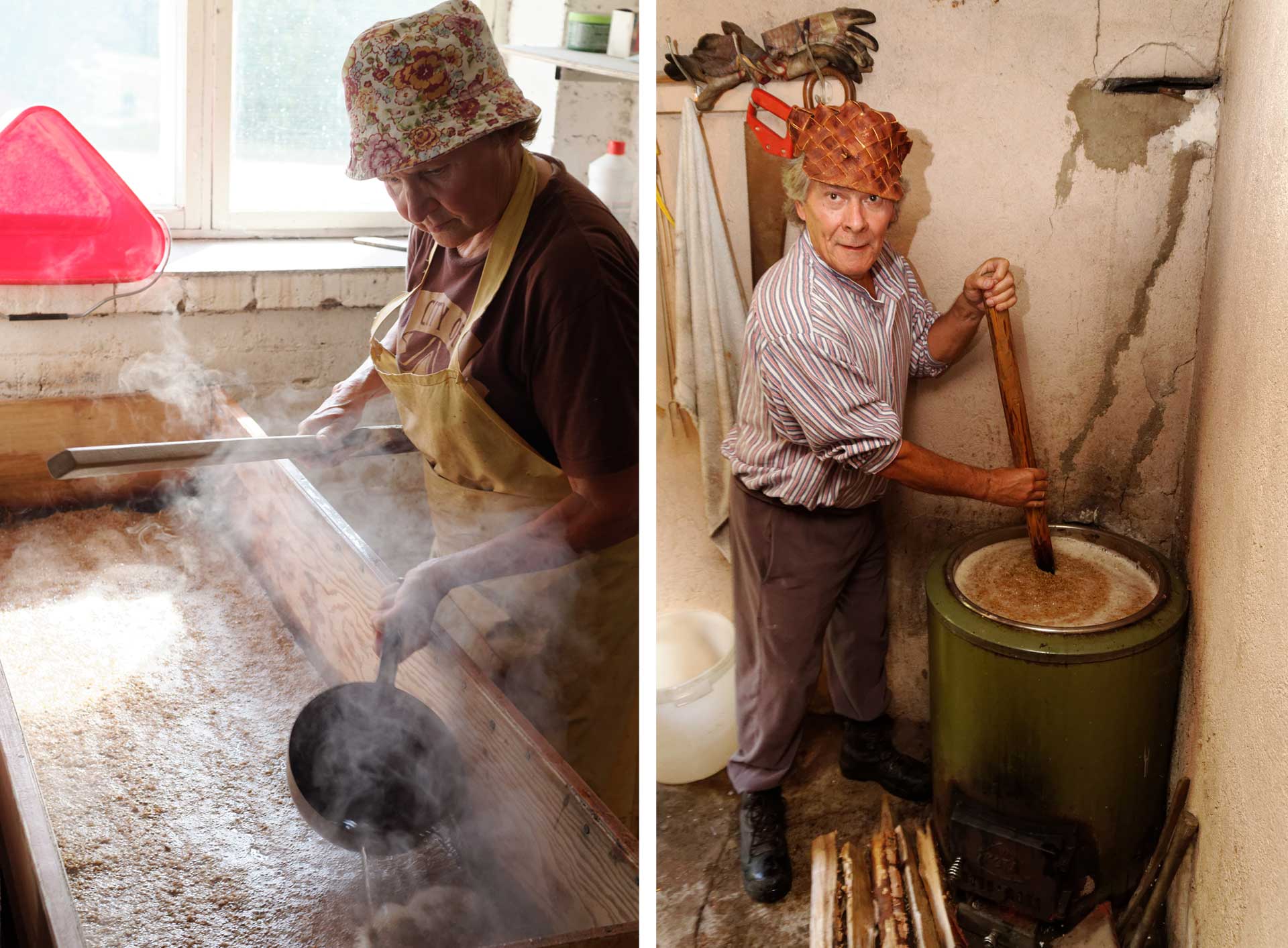 From Left: Eila Tuominen ladling the mash into the kuurna, in Pertunmaa; Seppo Lisma, wearing a traditional birch bark hat, stirring his mash in Ruovesi