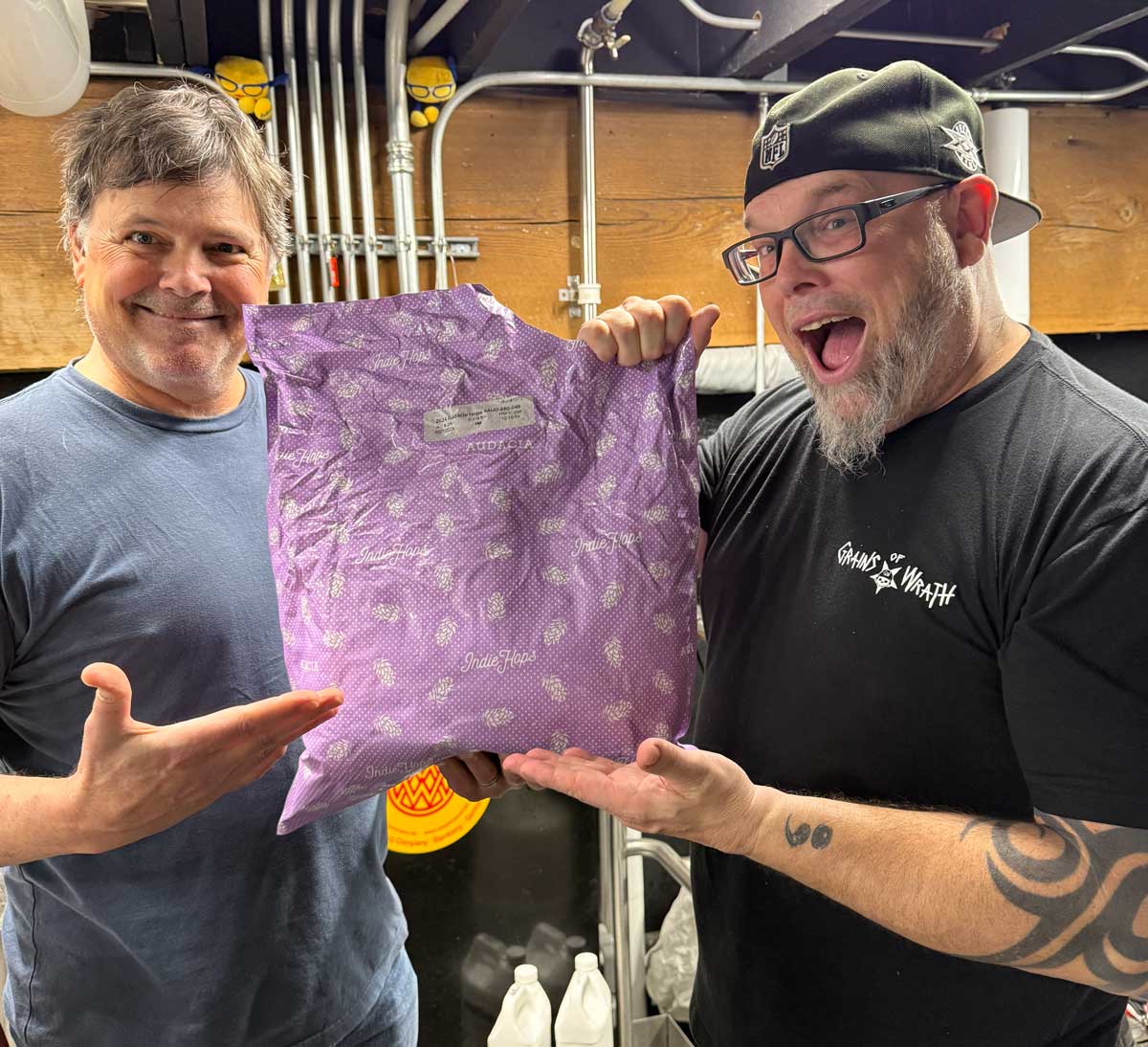 Indie Hops cofounder Jim Solberg (left) and Grains of Wrath owner/head brewer Mike Hunsaker (right) with a bag of Audacia pellets.