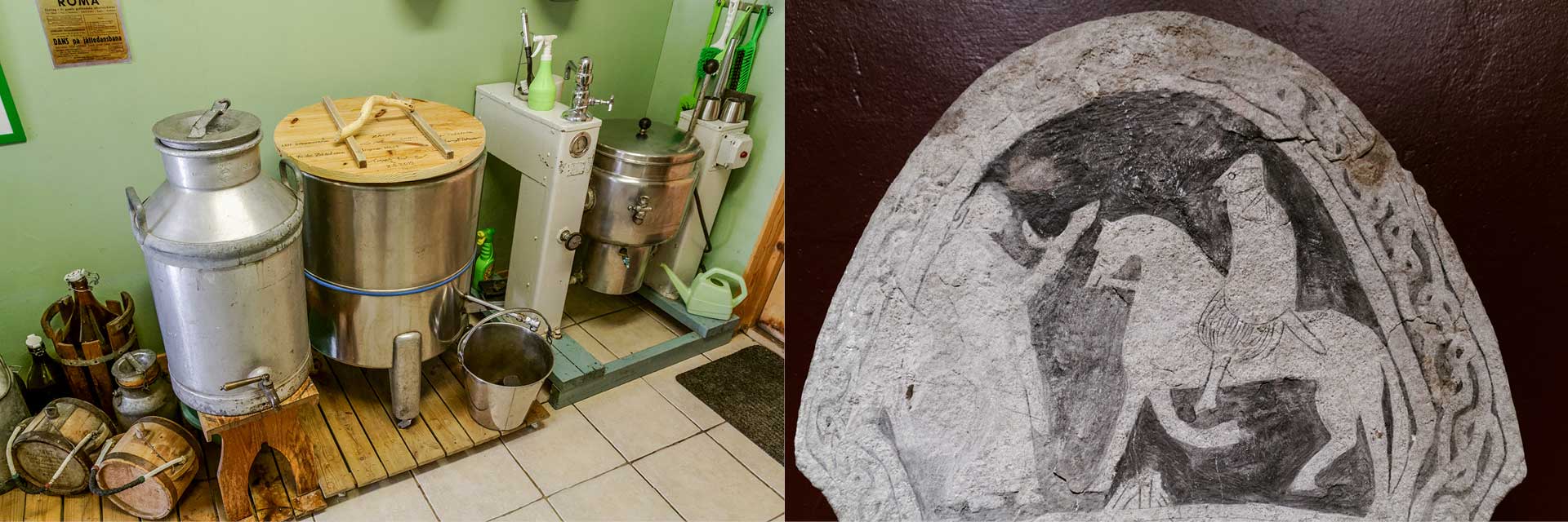 From left, a very small, home-based brewery in Gotland; a carving of unknown origin depicts historical consumption of “the drink;”