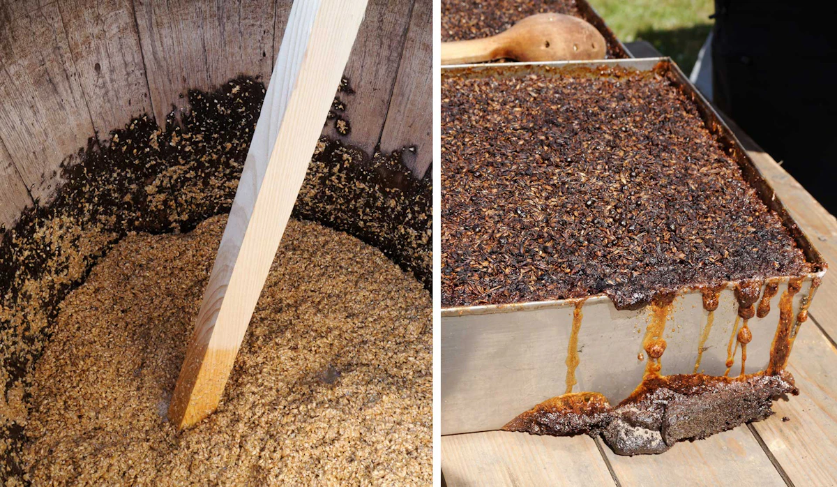 The mash boxes baked in the oven for three hours. When they came out, the top layer of the mash had turned a deep brown. Wort had boiled out of the boxes and congealed into globs of baked sugar. The top was hard, from the sugars sticking together, and it tasted like caramel and honey.