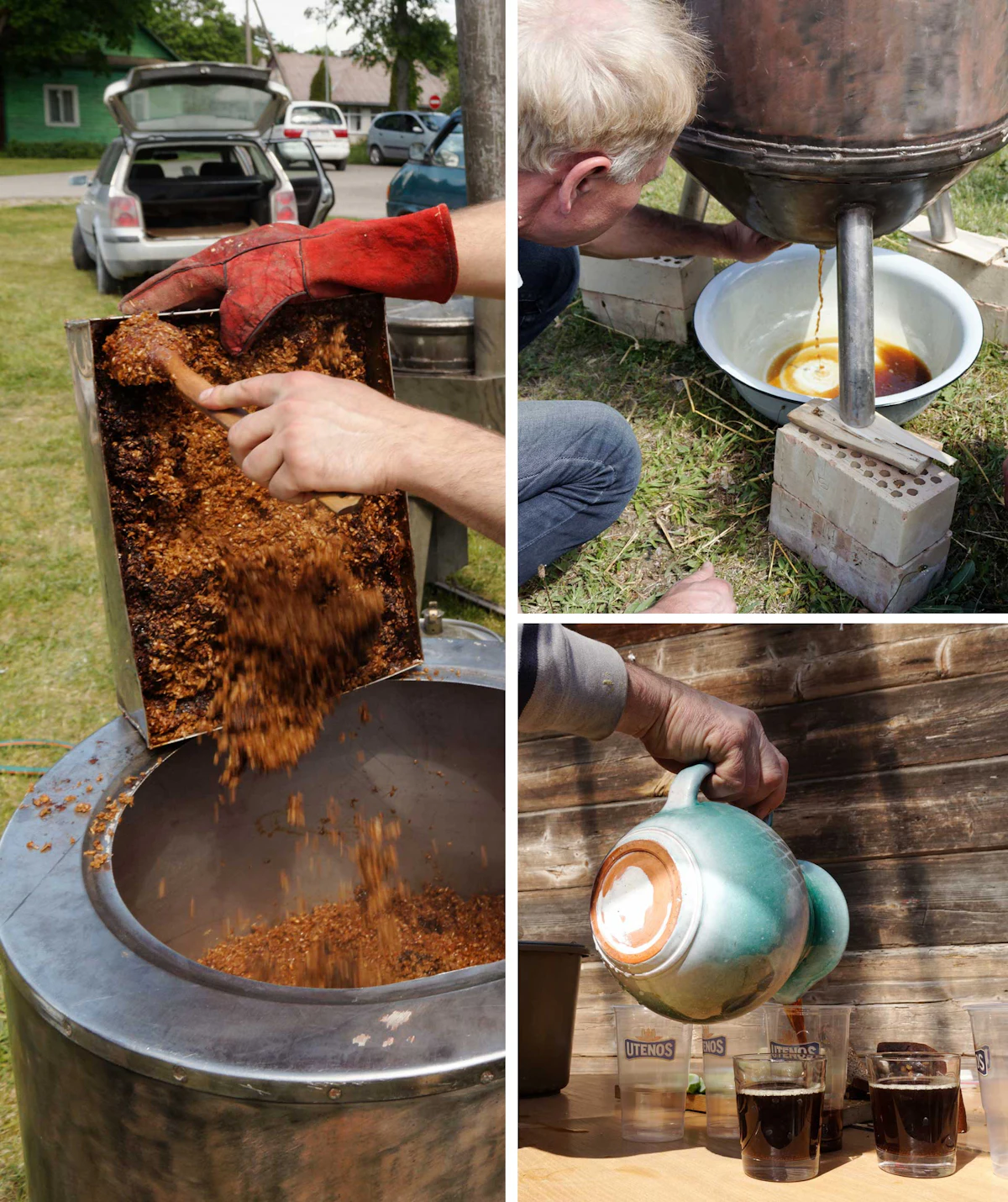 After baking the mash, the Jančyses removed the trays, used a big wooden spatula to break up the crust, then dumped the contents into their lauter tun—to which they had already added straw to act as a filter. They added some hot water, and the wort lautered out a porter-black color—despite the fact that it had been pale malt. They then cooled the wort and pitched their yeast—boiling wort appears to have been virtually unknown in Baltic farmhouse brewing.