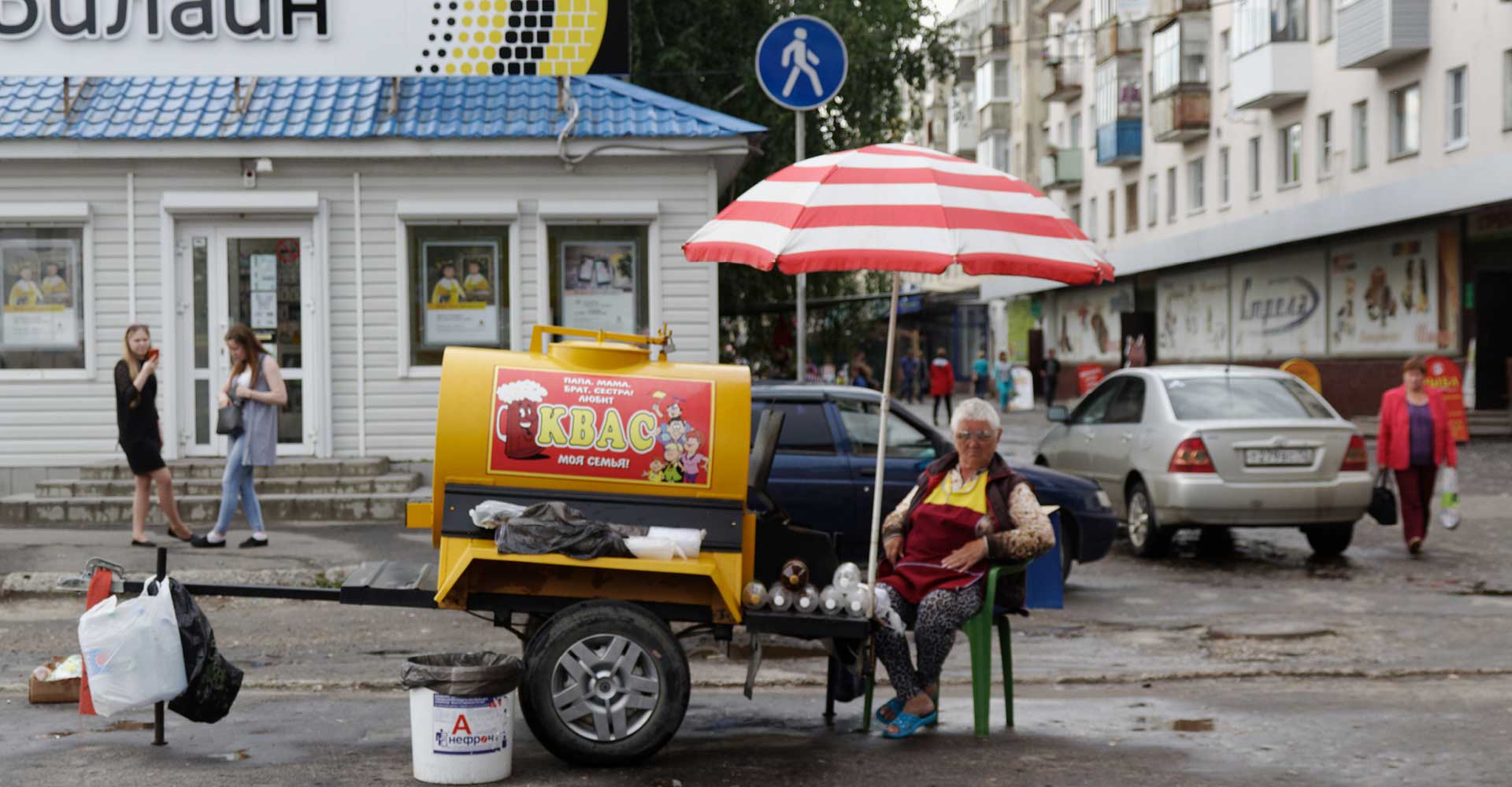 Street vendor with the classic yellow kvass tank, Yoshkar-Ola, Russia. Photo: Lars Marius Garshol