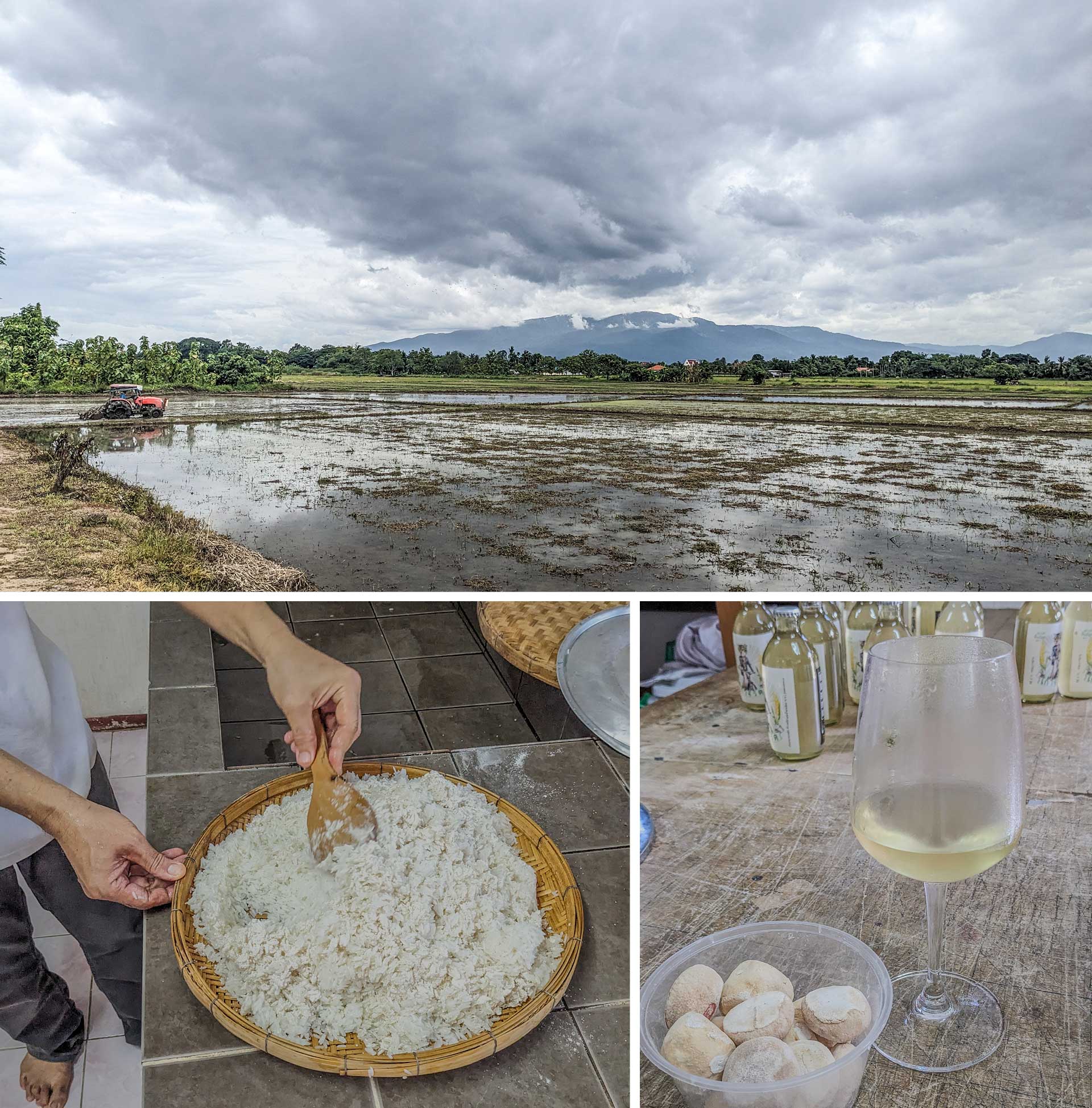 Clockwise from top: A sticky-rice field near Chiang Mai, with Doi Suthep in the backdrop; Khao Cheevit sato, with balls of luk paeng; at Surachae Phuenmueang, Berm mixes powdered luk paeng into steamed sticky rice. Photos: Joe Stange.