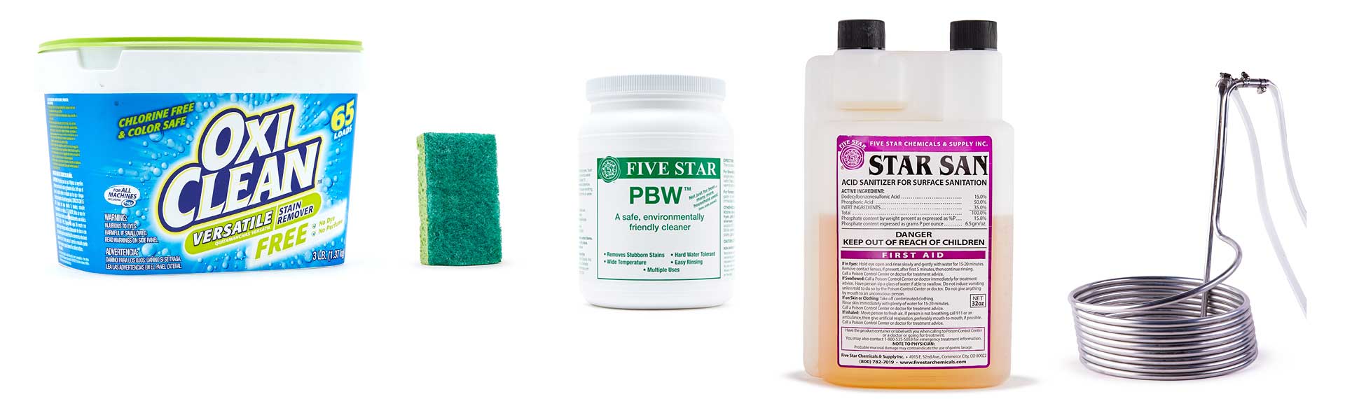 Cleaning needn’t be a protracted chore. Just clean your brewing equipment as you would your plates, pots, pans, and other kitchenware. Try to avoid using dish soap, though, as it can leave an invisible film that may destroy the head on your beer later on. Instead, wash your equipment using an oxygen-based detergent. Powdered Brewery Wash (PBW), formulated especially for brewers, is available from virtually all homebrew retailers and is the gold standard for cleaning brewing equipment. OxiClean, another excellent choice, is widely available, highly effective, and very affordable.