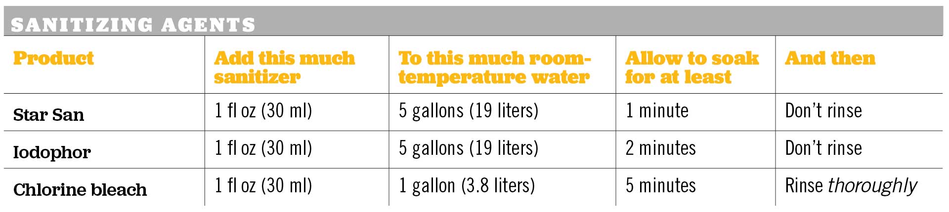 Acid-based sanitizers use a blend of food-grade acids to destroy wild bacteria and yeasts. The most popular of these is Star San, which you’ll find in most homebrew stores. Properly diluted, Star San requires only a minute of contact time to effectively sanitize any surface it touches and requires no rinsing once the job is done.