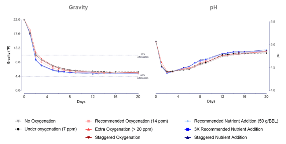 With a higher starting gravity, the viscosity of the wort will impact the solubility of oxygen. Be sure to keep this in mind when adding dissolved oxygen (DO) at knockout. A longer contact time or a higher rate might help.