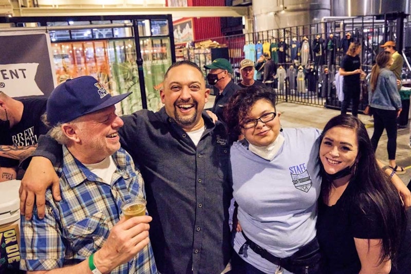 21st Amendment’s Shaun O’Sullivan (left) shares a laugh with the 21A crew at SF Beer Week’s East Bay Kick Off. Photo: Courtesy 21st Amendment Brewery